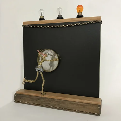 Humans Being, created from 1996 - 2000 is about Human Nature: complex, diverse and mysterious. In concert, Mother Nature furnishes me with a marketplace of earthen media: clay, wood and metal. These, integrated with found or orphaned treasures and modeled ceramic figures, are colored with fire, smoke, time and occasionally pigment. Compositions become commentaries on everyday issues, behaviors, virtues, shortcomings and relationships.