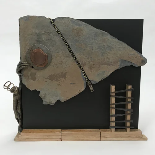 Piece of Mind began in 2021, and is comprised of an assortment of media - slate shards, steel scraps, clay, wire, found objects and my signature humans being. These sculptural essays echo the power of pieces while addressing issues of freedom, self-reflection, identity, the unhoused and the theater of life. They demonstrate how brokenness of materials and life can be made whole again and reinvented toward a positive state of tranquility and inner peace.