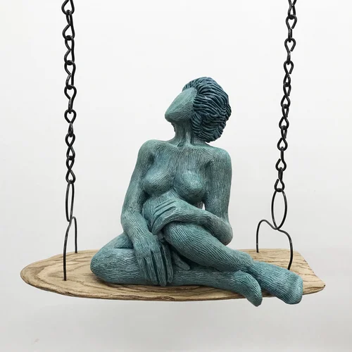 Our miscellaneous mood swings - our wavering states of mind add joie de vivre to our whirling festival of life. Mood Swings is a series of kinetic wall sculptures sold exclusively at THE WIT GALLERY in historic Lenox, MA. Clay figures are modeled, fired and colored with several layers of acrylic paint or ceramic glaze. Driftwood seats hang from branches and black steel chains. All connecting hardware is concealed within the wood. Mood Swings average between 35-40” high, projecting 5-9” from the wall, inviting and enabling motion. The branches rest atop custom made steel brackets.